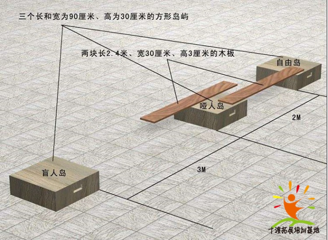 拓展培訓道具:2米長的繩子;若干副手套(供搬運木板的學員使用);足夠多的眼罩;根據小項目的設置,準備所需物品。三個島嶼的任務書各一張;雞蛋兩個;筷子兩雙;廢報紙兩張;網球或羽毛球一個;紙婆或小桶一個;膠帶一卷。